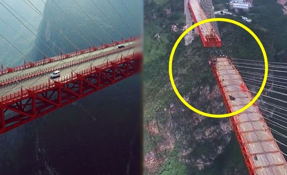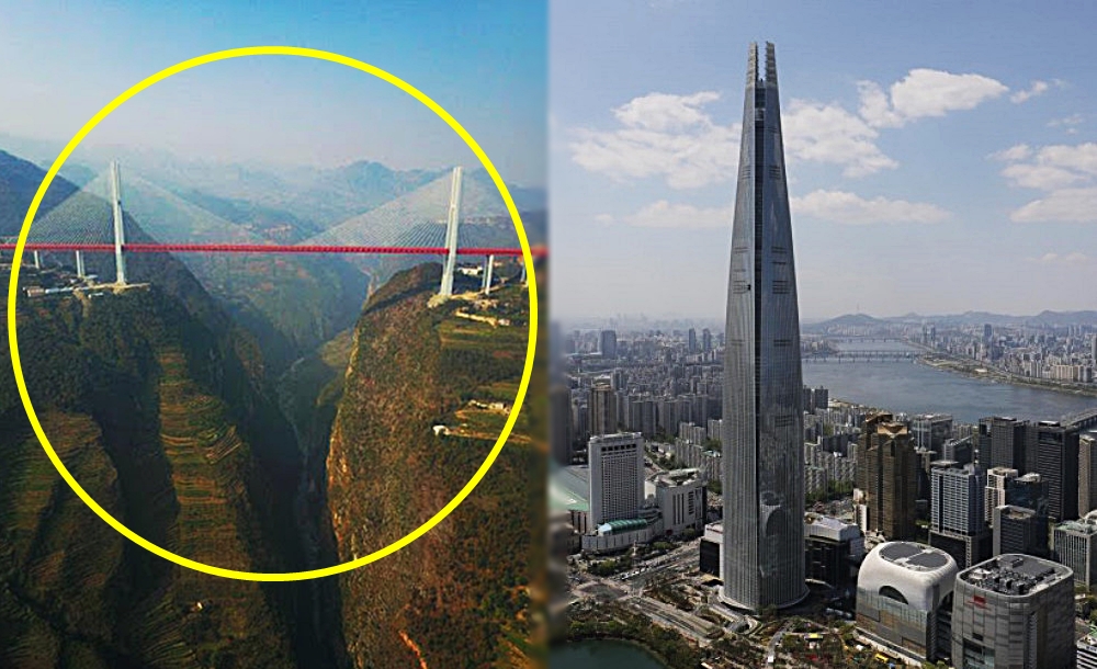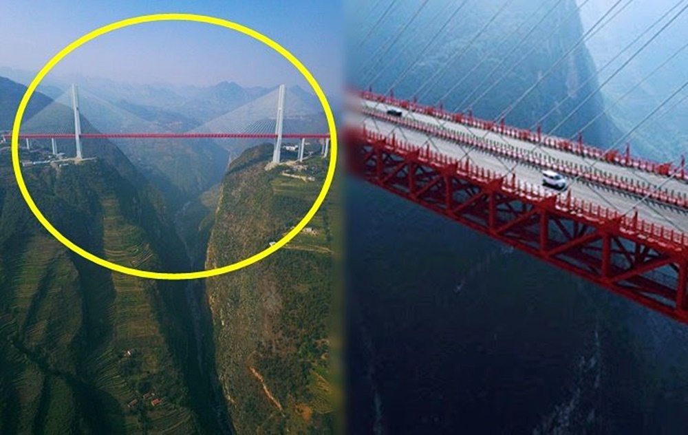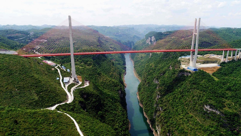 세계에서 가장 높은 다리는 구이저우성에 있습니다. 바로 베이판장 다리입니다. 계곡 바닥에서 이 다리의 상판까지 높이는 565m인데요. 이 길이는 200층짜리 빌딩의 높이와 맞먹고 있습니다. 참고로 잠실 롯데 월드 타워의 높이는 555m인데요. 건물 꼭대기에 다리가 놓여있다고 생각하면 되겠네요.