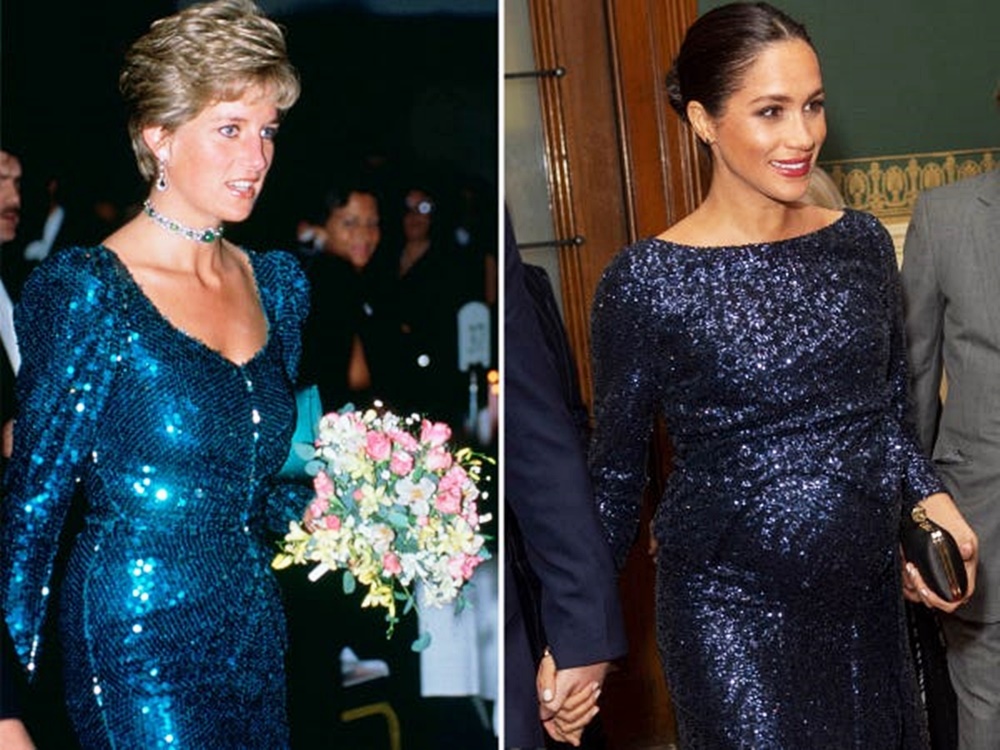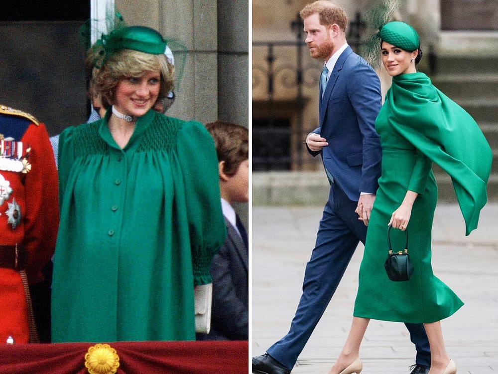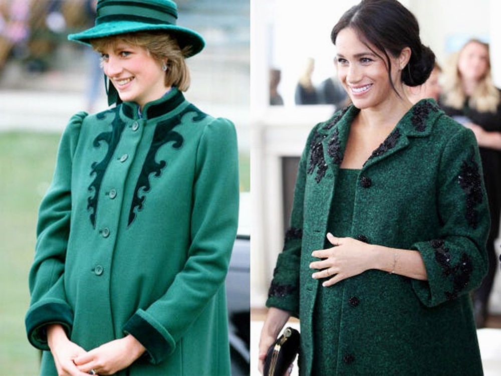 2019년 3월 임신한 메건 마클은 초록색 원피스와 코트를 입었습니다. 그리고 여기에는 세퀸으로 플로럴 무늬가 장식되어 있었죠. 다이애나비도 임부복으로 비슷한 옷을 입은 적이 있었습니다. 바로 1982년 윌리엄 왕자를 임신할 당시 입었던 옷입니다.