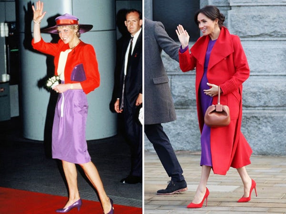 2019년 1월 첫 아이를 임신하고 있었던 메건 마클은 보라색과 빨간색을 매치해 입었습니다. 이 모습은 1989년 다이애나비가 홍콩을 방문했을 때 입었던 옷을 떠올리게 했는데요. 다이애나비는 화이트 컬러의 블라우스에 레드 카디건, 그리고 무릎까지 오는 보라색 스커트와 보라색 구두를 신었습니다.