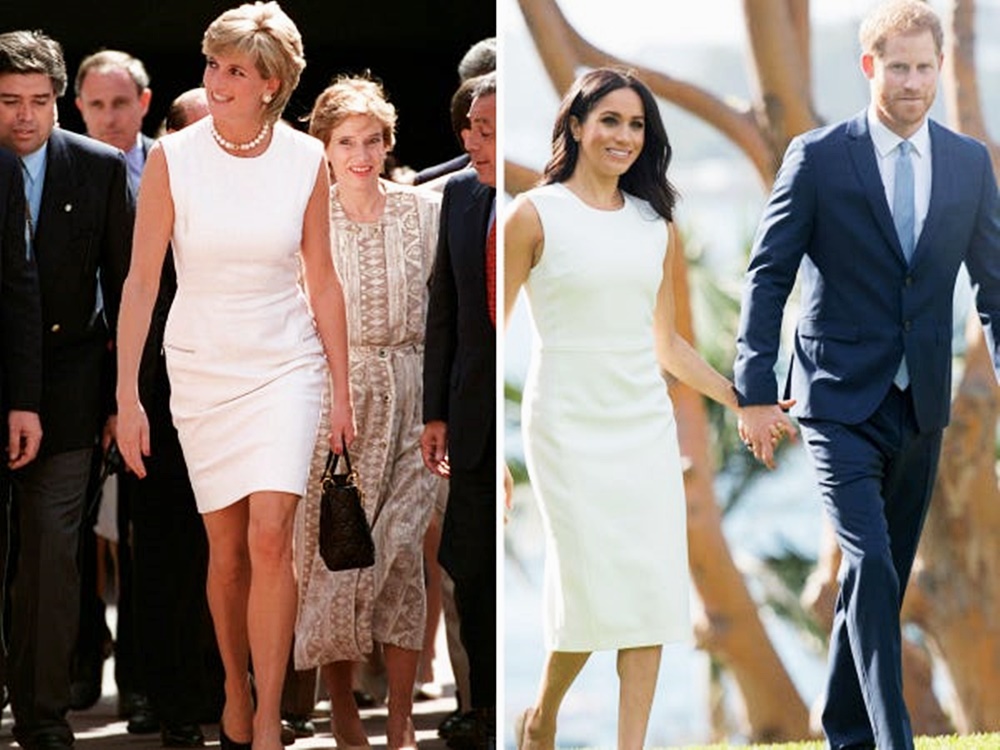 2018년 10월 메건 마클은 소매가 없는 흰색 원피스를 입고 호주를 방문했습니다. 이 모습은 1995년 아르헨티나를 방문한 다이애나비의 모습을 떠올리게 했는데요. 다이애나비 또한 슬리브리스 화이트 원피스를 입었네요. 메건 마클은 여기에 다이애나비에게서 물려받은 주얼리를 착용하기도 했는데요. 더욱 향수를 자극하며 큰 화제가 되었죠.