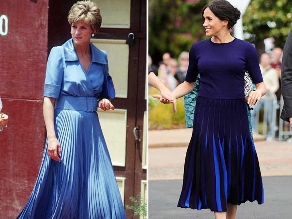1992년 이집트에 간 다이애나비는 블루 컬러의 플리츠스커트를 입었습니다. 2018년 10월 메건 마클은 비슷한 스타일의 옷을 입었는데요. 다이애나비의 의상보다 조금 더 진하고 깊은 색상이었죠.