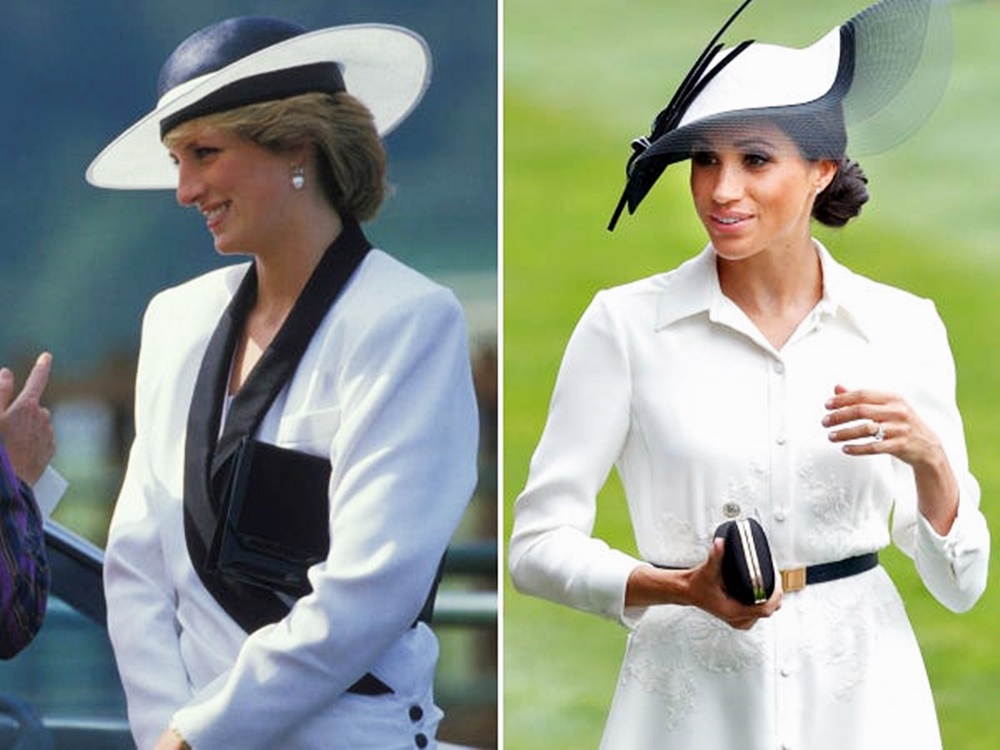 1985년 6월 18일 다이애나비는 매년 열리는 로열 애스코트 경주에 흰색 블레이저와 블랙 앤 화이트 컬러의 모자를 쓰고 등장했습니다. 33년 후 메건 마클은 같은 행사에 비슷한 모자를 쓰고 나타났네요. 메건 마클은 지방시 드레스에 블랙 벨트 그리고 블랙 클러치로 룩을 완성했습니다.