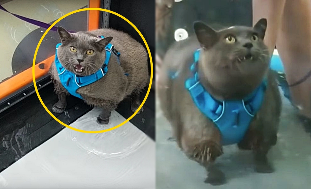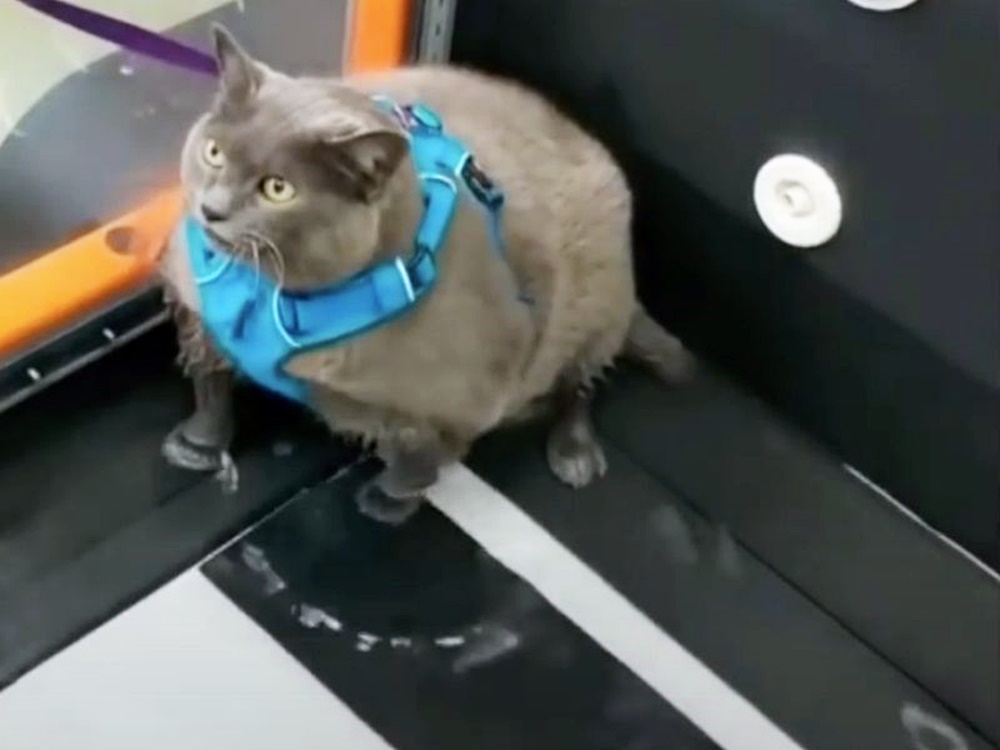 신더블락의 체중을 감량하기 위해 수의사는 식단과 운동을 계획했습니다. 그 중 하나는 바로 물이 있는 런닝머신에서 운동을 하는 것이었죠. 이에 신더블락은 가슴줄을 차고 런닝머신 안으로 들어갔습니다. 그러나 열심히 운동을 해도 모자랄 이 시점에 신더블락은 런닝머신의 구석으로 가 한 발로 움직이는 런닝머신 위에 올려놓은 채 자신은 런닝머신 위에 올라가지 않을 거라고 말하는 것처럼 격렬하게 저항하고 있습니다.