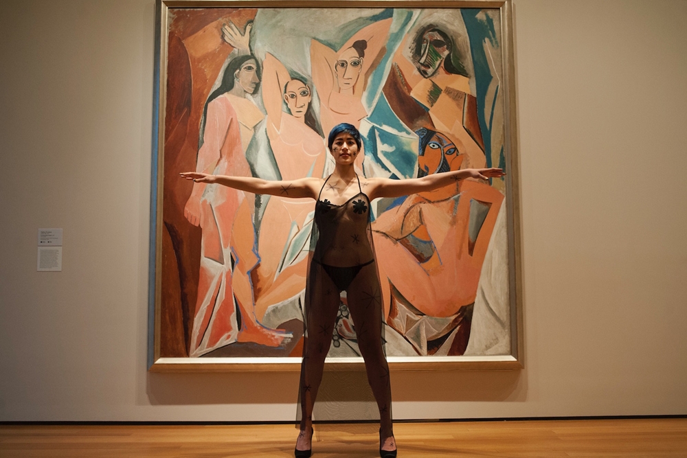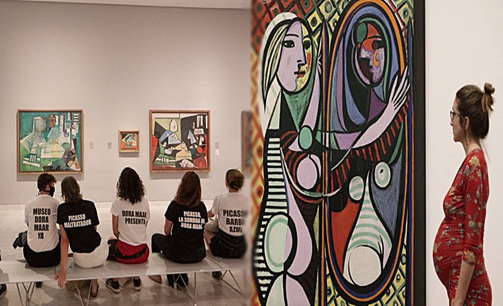 한편 최근 몇 년 피카소의 여성 편력, 여성 학대에 관한 관점이 점점 더 부각되고 있습니다. 2018년 공연에술가 엠마 술코비치는 피카소의 작품 '아비뇽의 여인들' 앞에서 온 몸에 별모양을 그린 뒤 시위를 벌였는데요. 이는 뉴욕타임스에 실린 기사의 내용 중 '피카소는 20세기 여성들에게 최악의 행동을 저지른 사람으로 꼽히지만, 그의 그림을 미술관에서 뺄 수 있는가? 예술은 예술로 봐야 한다'는 내용에 대한 항의의 한 방법이었습니다.