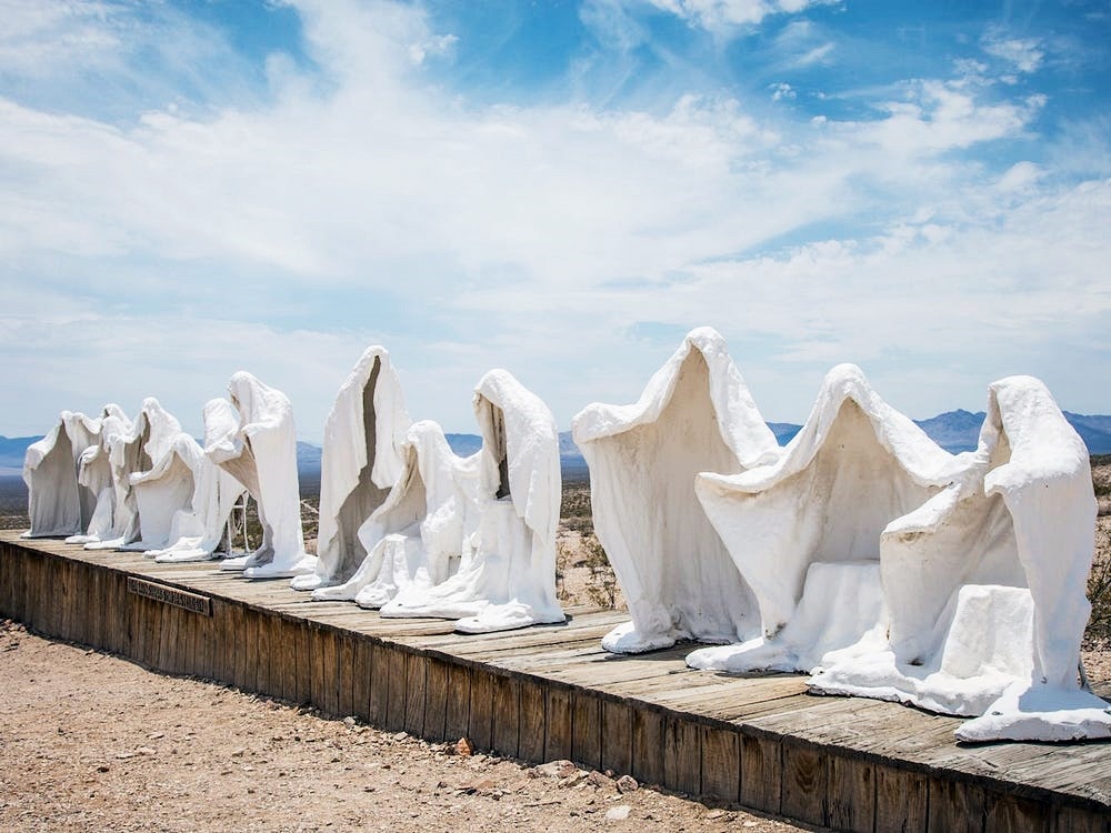 이곳에 있던 흰망토 입은 사람들에게는 작품명이 붙어있습니다. 하나는 '최후의 만찬'이고, 또 하나는 '고스트 라이더'라고 하네요. 최후의 만찬은 레오나르도 다 빈치의 유명한 작품에서 영감을 받아 만든 것이며, 이 형식을 통해 현대 미국 남서부에 살고 있는 미국인들의 모습을 재해석한 것이라고 하네요. 사실 이 작품은 2년 동안만 설치되고 이후에는 철거될 예정이었으나 10년이 넘는 시간 동안 이 도시를 지키고 있습니다.