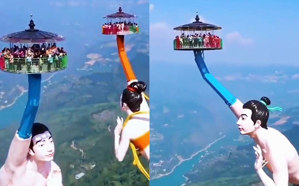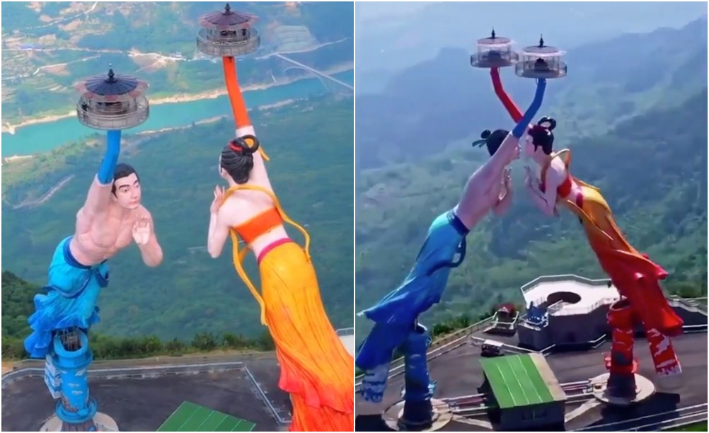 충칭에 있는 두 산에 얽힌 설화입니다. 이 설화는 중국판 '견우와 직녀'라고 불리고 있는데요. 이 설화를 모티브로 만들어진 한 관광지가 중국 네티즌들 사이에서 큰 화제가 되고 있습니다. 바로 '플라잉 키스'라는 이름의 전망대입니다. 이 전망대는 충칭 백마산의 해발 1,250미터 절벽에 위치하고 있습니다.