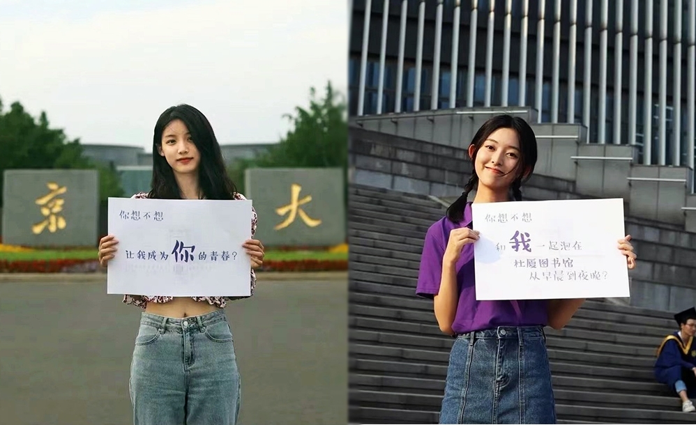 이 광고는 캠퍼스 내에서 난징대학교 학생들이 문구가 적힌 종이를 들고 있는 것이었는데요. 이 광고 이미지 6개 중 두 개가 가장 많은 비난을 받았습니다. 그 중 하나는 한 여대생이 '아침부터 밤까지 나랑 도서관에서 살래?'라는 팻말을 들고 있는 이미지였고, 또 하나는 '네 청춘의 일부가 되어줄까?'라는 문구를 들고 있는 이미지였습니다. 심지어 이 이미지 속 여대생은 크롭티셔츠를 착용해 배꼽이 훤히 보이는 복장이었기에 더욱 논란이 됐죠. 한편 남대생이 팻말을 들고 있는 광고 이미지에는 전혀 성적인 의미를 암시하는 문구가 없었습니다. 남성이 든 팻말에는 '정직하고, 부지런하고, 야심 있는 난징대학교의 학생이 되고 싶나요?'라는 문구였습니다.