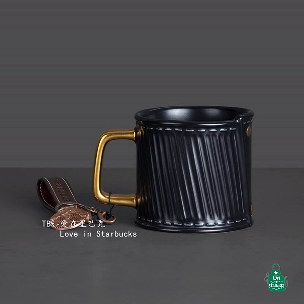 두 번째는 텀블러입니다. 텀블러 또한 매트한 블랙 컬러로 이루어져 있는데요. 콜드컵과 마찬가지로 빈티지 가족 홀더가 스트랩과 함께 제공됩니다. 머그잔도 있습니다. 이 머그잔은 인더스트리얼 스타일인데요. 금색 손잡이가 블랙 컬러의 컵과 매우 잘 어울리는 것 같습니다. 머그잔은 브론즈 열쇠고리와 세트인데요. 이 키열쇠고리에는 스타벅스의 사이렌이 새겨져 있으며 여기에도 가죽 스트랩이 달려 있네요. 특히 이 열쇠고리를 사려고 머그잔을 사는 사람들이 많다는 후문입니다.