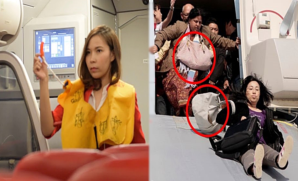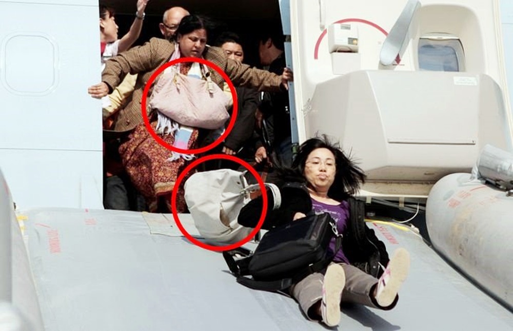또한 수하물을 가지고 탈출하다 이를 놓치게 되면 뒤에 있는 사람들이 걸려 넘어지거나 부상을 입을 수도 있습니다. 특히 큰 가방을 움켜쥐고 슬라이드를 탔다가 혹여나 가방을 노힌다면 앞에 가던 승객을 덮칠 수도 있어 매우 위험합니다.