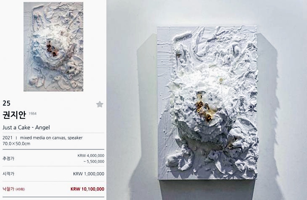 이 여세를 몰아 솔비는 서울옥션 스페셜 경매에 '저스트 어 케이크' 시리즈의 한 작품인 '엔젤(Angel)'을 출품했습니다. 이 작품은 가로 50cm, 세로 70cm 사이즈의 블루투스 스피커에 작업한 작품입니다. 솔비는 블루투스 스피커를 캔버스 삼아 이곳에 순백색이지만 어지럽고 혼란스러운 입체 부조 작품을 완성시켰고, 그 안에는 자신의 신곡 '엔젤'을 삽입해 미술과 음악을 결합했죠. 솔비는 낙착자에게 '엔젤'의 음원 공개 여부 결정권, 즉 음원 유통에 대한 동의권을 같이 포함시키는 실험을 하기도 했는데요. 만약 낙찰자가 이 음악을 대중들에게 공개하는 것을 원치 않는다면 '엔젤'은 단 한 사람만의 음악으로 소장되는 것입니다. 결국 이 작품은 49회의 경합 끝에 1,010만 원에 낙찰되었습니다.