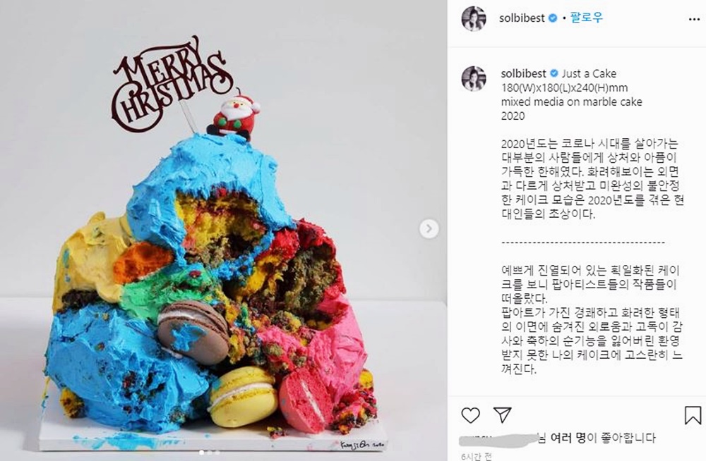 이 작품을 소개하려면 지난 해 있었던 '케이크 표절 사건'을 언급하지 않을 수 없습니다. 이 작품의 모티프가 된 사건이기 때문입니다. 지난 2020년 12월 솔비는 인스타그램을 통해 자신이 직접 만든 케이크 사진을 공개했습니다. 솔비는 '요즘은 사회적 거리두기로 제빵실에서 케이크 만드는 거에 푹 빠져있다'라는 글도 함께 올렸는데요. 이후 이 케이크는 표절 논란이 일었죠.