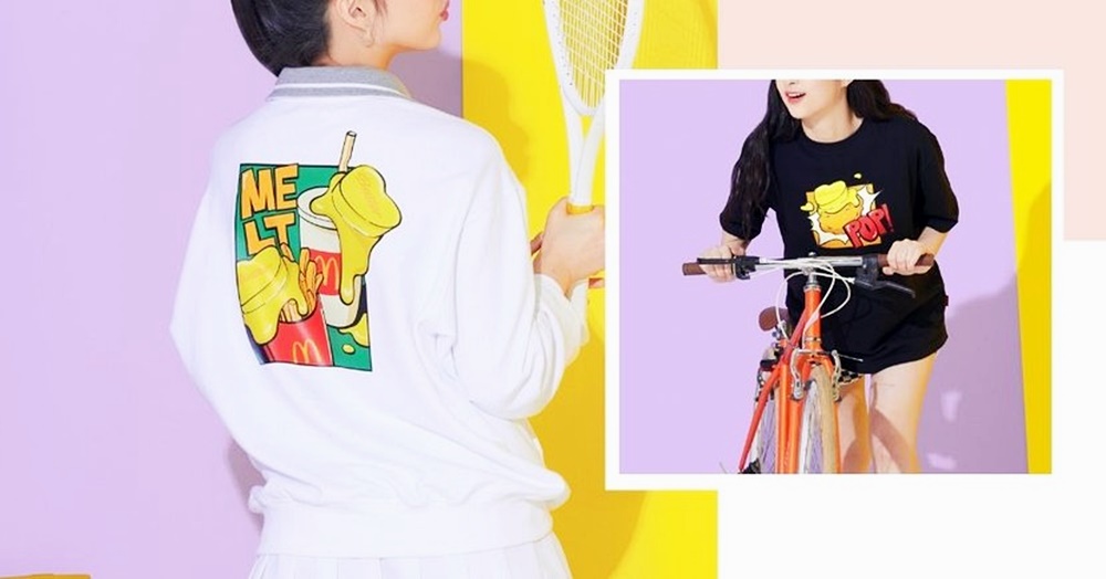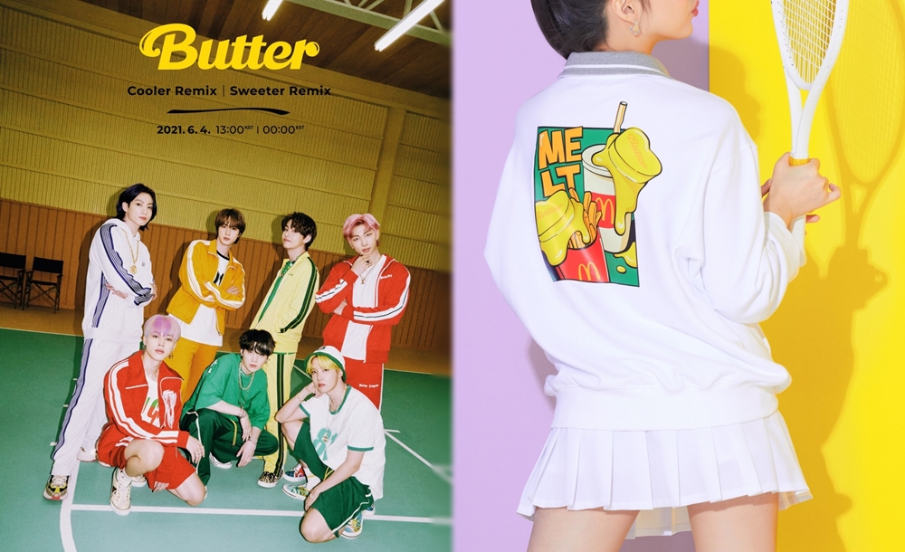 다음은 멜팅 콜렉션입니다. 멜팅 컬렉션은 방탄소년단의 신곡인 '버터'를 모티프로 만들어진 팝아트 디자인으로 구성되어 있습니다. 맥도날드의 후렌치후라이와 음료, 그리고 너겟 등 맥도날드 제품의 위에는 하트 모양의 노란색 버터가 녹아 있으며 'POP' MELT' 등의 레터링이 팝아트적인 요소를 더하고 있습니다. 멜팅 컬렉션에는 스웨터, 티셔츠, 파자마 세트, 핸드폰 스트랩, 토트백, 양말, 캐리어 등이 포함되어 있네요.