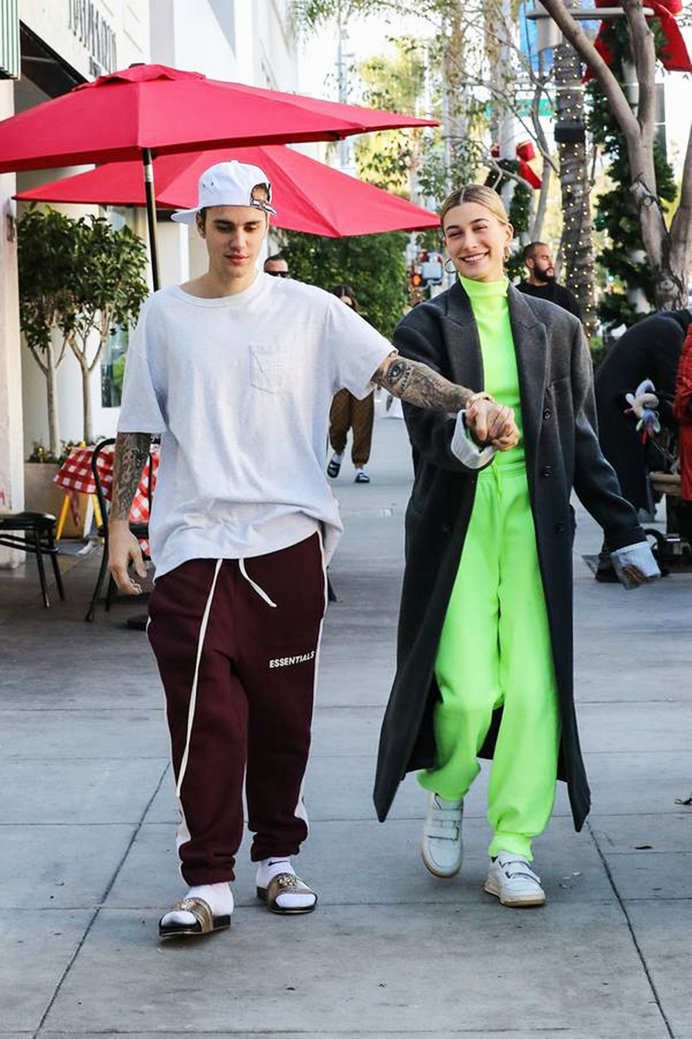 헤일리 비버는 또 한번 네온 그린 컬러 색상에 대한 사랑을 보여줬습니다. 바로 네온 그린 컬러의 트랙슈트를 입고 등장한 것이었습니다. 헤일리 비버는 자신의 트레이드마크인 트랙슈트에 오버사이즈 코트를 매치했네요.