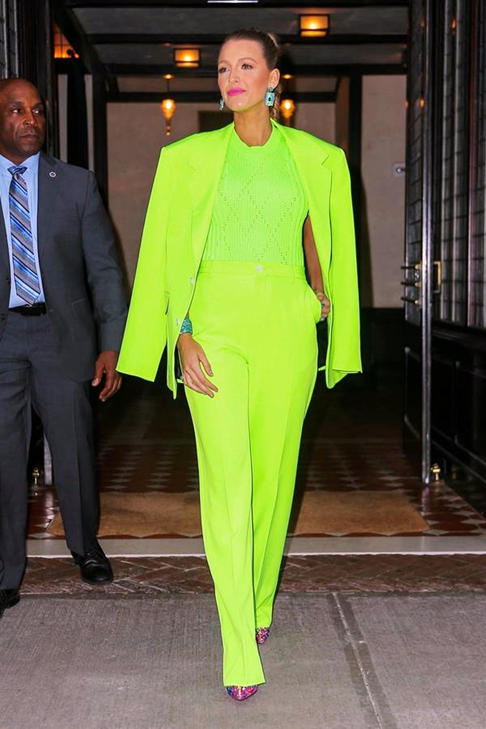 네온 컬러의 슈트를 입고 등장한 블레이크 라이블리. '인간 형광펜'이라고 불러도 손색없을 정도의 색감과 애티튜드를 선보이고 있네요. 보통 네온 컬러 패션이 다소 심플했다면 블레이크 라이블리는 맥시멀 리스트 패션이 무엇인지 보여주고 있는 것 같은데요. 스파클이 잔뜩 붙어있는 핑크색 힐, 그리고 힐의 색상과 맞추려고 노력한 립 컬러, 청록색 이어링과 뱅글 등을 매치해 '글램룩'이란 무엇인지 보여주고 있는 것 같습니다.