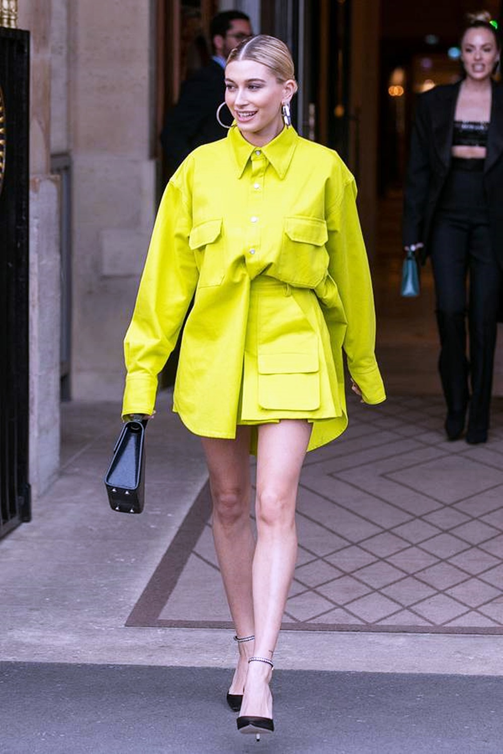 네온 그린 컬러의 오버사이즈 셔츠와 치마를 매치한 헤일리 비버. 여기에 깔끔한 검정색 핸드백과 검은색 하이힐을 매치해 자칫하면 붕붕 떠다닐 수 있는 컬러를 잡아줬습니다. 머리 또한 깔끔하게 포니테일로 묶었으며 볼드한 후프 이어링으로 깔끔한 스타일링을 완성했네요.