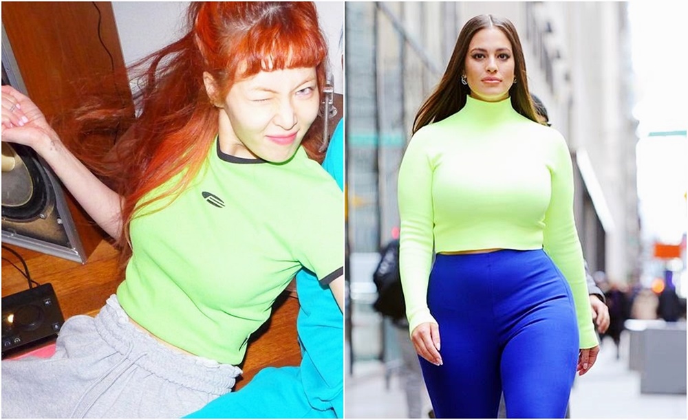 플러스 사이즈 모델 애슐리 그레이엄입니다. 애슐리 그레이엄은 네온그린 컬러와 딥블루 색상을 함께 매치했습니다. 이 두 색상은 매우 잘 어울리는 조합 중의 하나인데요. 군더더기 없는 의상 디테일에 컬러로 포인트를 준 패션입니다.