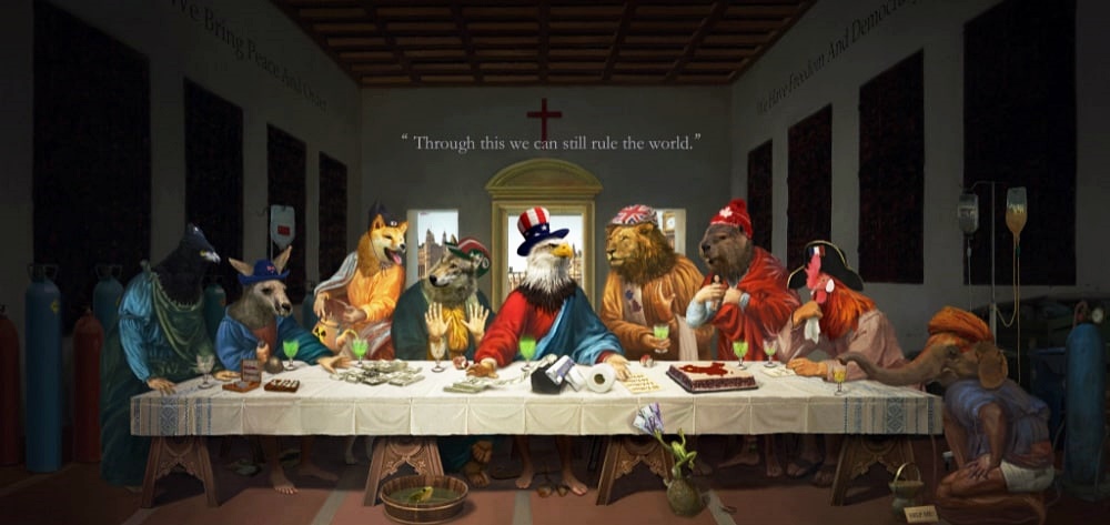 먼저 가장 최근에 화제가 된 작품은 <최후의 G7>입니다. 이 작품은 레오나르도 다빈치의 걸작 <최후의 만찬>을 패러디한 것인데요. 그래픽 아티스트 반퉁라오아탕이 제작한 것이죠. 길쭉한 테이블 위에는 동물들이 만찬을 즐기고 있습니다. 테이블 가운데 앉은 예수의 얼굴에는 미국을 상징하는 흰 독수리를, 나머지 제자들의 자리에는 늑대(이탈리아), 시바견(일본), 캥거루(호주), 사자(영국), 비버(캐나다), 코끼리(인도)를 그려 넣었습니다.