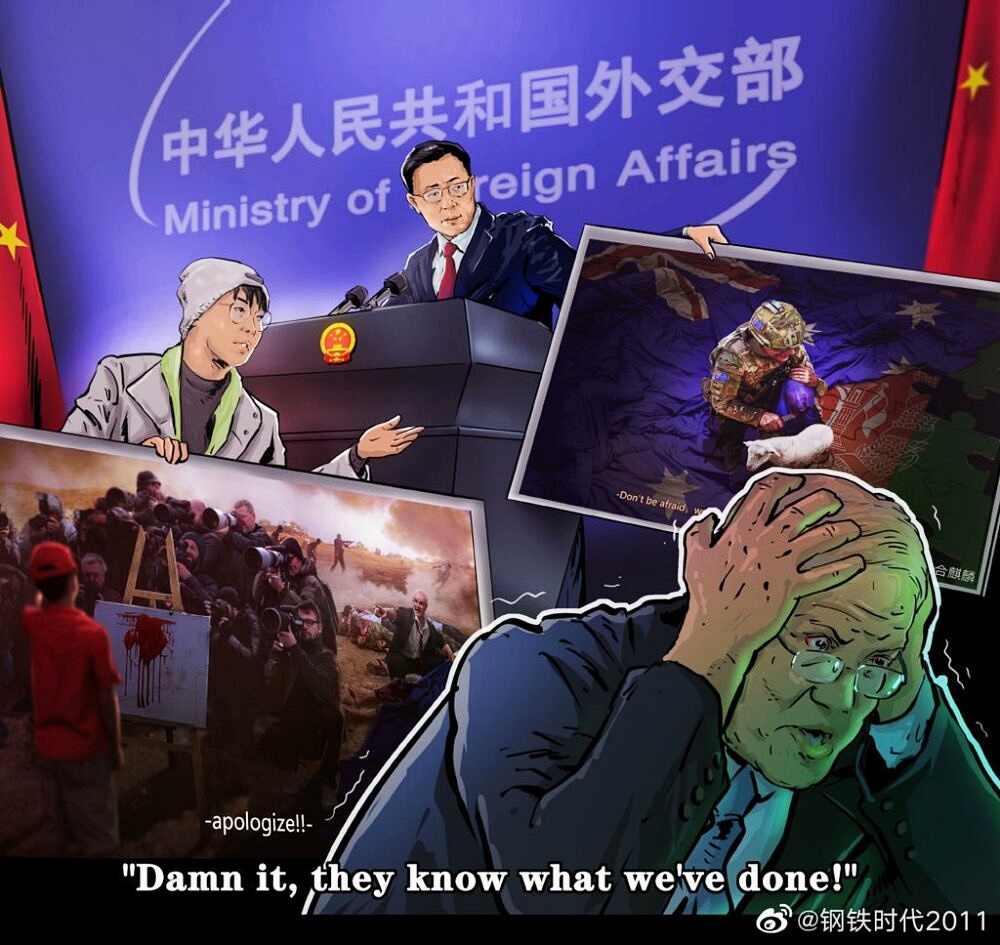 이뿐만이 아닙니다. 우허치린의 작품 <평화의 군대> 또한 큰 반향을 일으켰습니다. 이 그림은 지난해 11월 그린 것인데요. 호주 군인은 어린양을 안은 소년의 목에 피 묻은 칼을 겨 누고 있습니다. 이 호주 군인은 아프간에 파견된 것인데요. 호주 군대가 아프간에서 벌인 만행을 고발하는 것이 그 주제이죠. 배경에는 미국을 따르며 중국과 각을 세우는 호주를 비난하기 위한 의도가 깔려 있는 것으로 보입니다. 이 그림은 중국의 외교부 대변인이 퍼 나르며 화제가 되기도 했습니다. 우허치린은 5월 초 G7 외무장관 회의를 풍자한 시사만화도 만들었는데요. G7 외무장관을 1900년 의화단 사건을 진압한다는 구실로 중국을 침공한 영국, 미국, 프랑스, 독일 등 8개국 연합군에 빗대기도 했습니다.