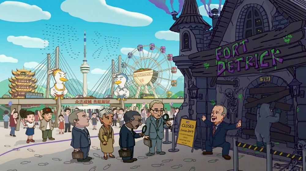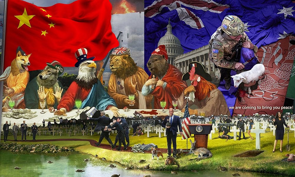 이 그림에는 풍자와 상징이 가득한데요. 일본을 상징하는 시바견은 원자력 마크가 그려져 있는 주전자에서 초록색 물을 따르고 있는데요. 이는 후쿠시마 원전 오염수 해상 방류를 의미하는 것이었습니다. 인도를 상징하는 코끼리는 테이블 아래에서 피를 흘리며 무릎을 꿇고 앉아 있는데요. 이는 인도의 코로나19 상황을 비꼰 것입니다. 또한 캐나다를 상징하는 비버는 중국 인형을 꼭 붙잡고 있는데요. 이는 2018년 캐나다 공안에게 체포된 뒤 캐나다에 체류 중인 멍완저우 화웨이 사장을 가리키는 것입니다. 또한 테이블 위에는 중국 국기가 그려진 케이크가 있어 이들이 중국을 먹어 치우려는 야욕을 드러내고 있다는 것을 표현하고 있습니다.