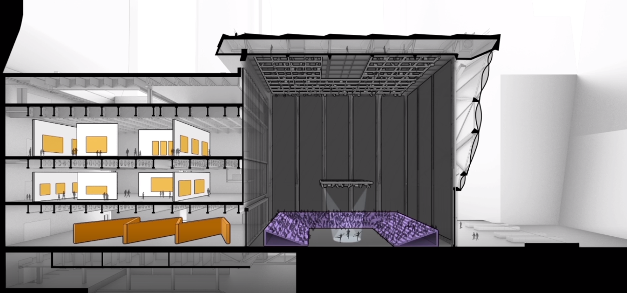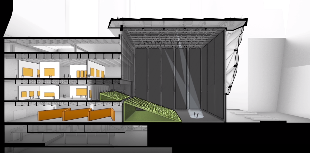 1번은 로비입니다. 로비에서는 더 셰드에서 열리는 모든 공연 정보를 알 수 있습니다. 그리고 이곳에는 유명 셰프가 운영하는 레스토랑과 바가 있습니다. 2번과 5번 공간은 갤러리입니다. 그림, 조각 등을 전시할 수 있습니다. 6번 공간은 공연장으로 총 500석 규모이며 이곳의 이름은 Kenneth C. Griffin Theater입니다. 3번 공간이 바로 The McCourt라고 불리는 시그니쳐 공연장이며 4번 공간은 광장입니다.
