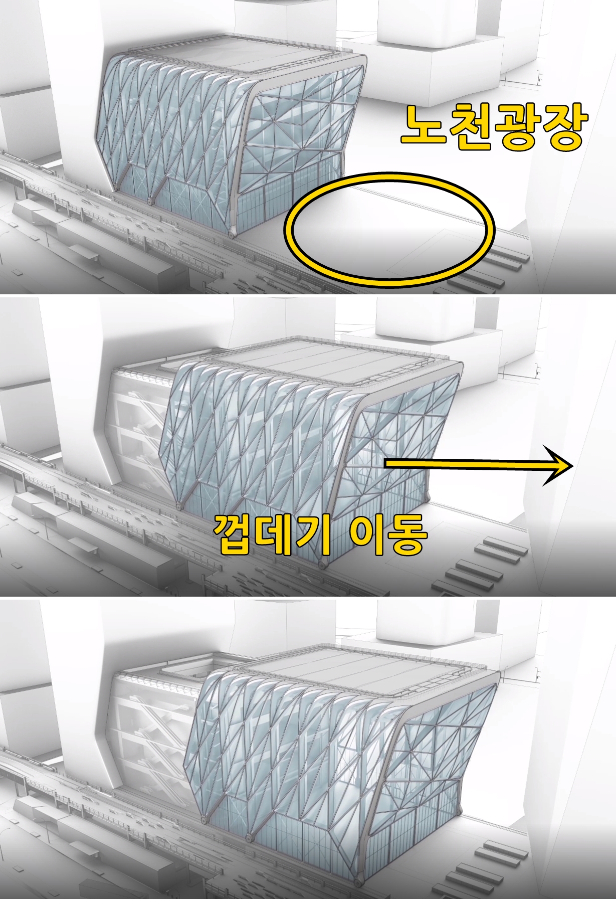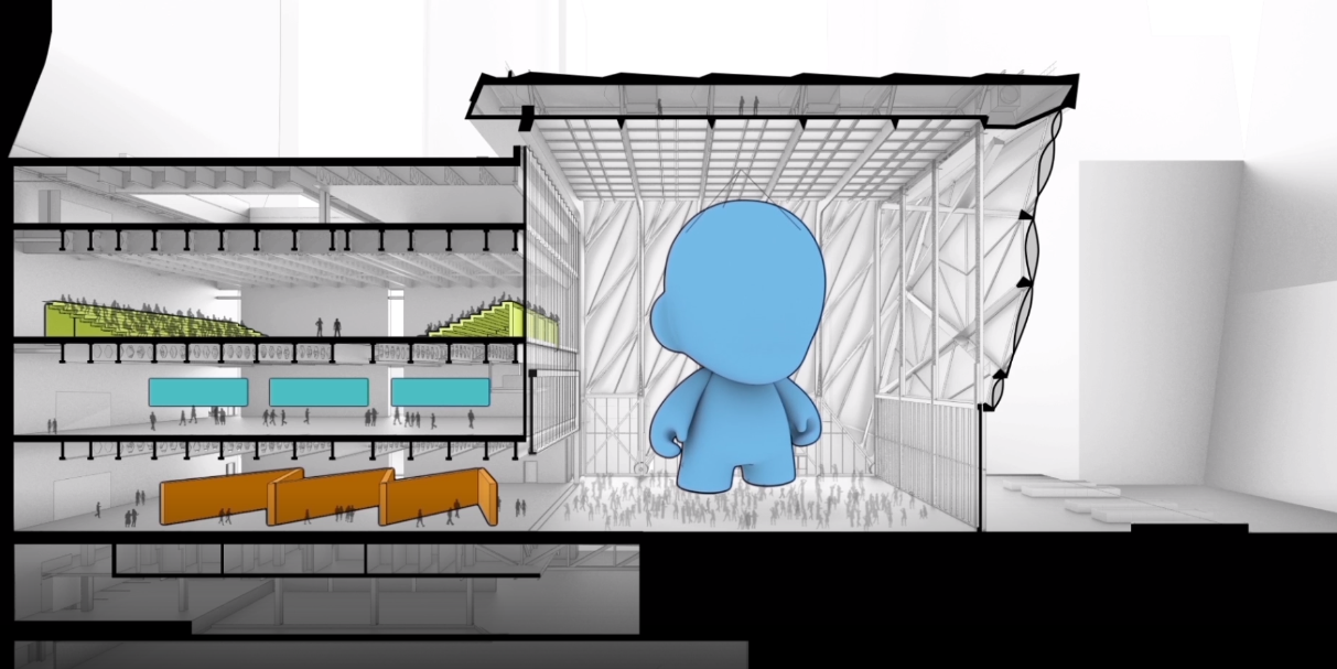 이 건물에는 '껍데기(shell)'라고 불리는 덮개가 있습니다. 철골구조에 특수 유리를 입혀 만들어진 이 덮개는 레일 위에 올려져 있어 앞 뒤로 이동이 가능합니다. 덮개를 노천광장 쪽으로 끌어당기면 이 비어있던 광장이 실내로 바뀌는 것입니다. 이 공간은 공연의 용도에 따라 다양하게 사용될 수 있습니다.
