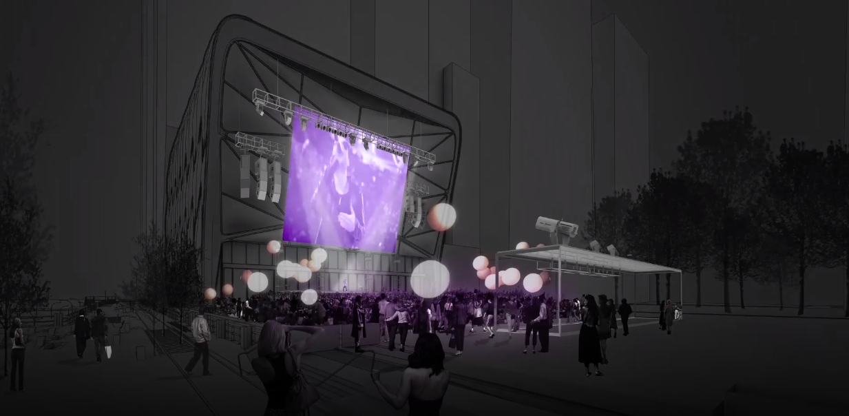 더 셰드의 바깥은 축제를 즐길 수 있는 장소로 사용할 수도 있습니다. 대형 프로젝터와 스크린을 통해 내부에서 진행되고 있는 이벤트를 생중계할 수도 있고, 월드컵 등의 대형 스포츠 이벤트를 송출하는 것도 가능하겠네요.