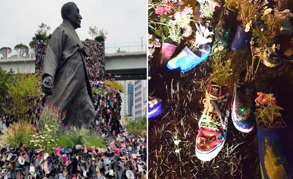 취지는 좋았지만 많은 시민들의 호평은 받지 못했습니다. 심지어 작품이 비를 맞자 헌 신발에 물이 고였고 악취까지 나며 민원제기가 이어졌고 결국 이 작품은 철거되고 말았습니다.