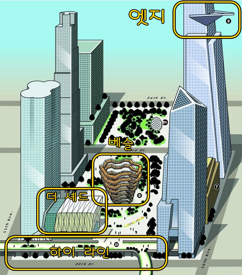 뉴욕의 에펠탑이라 불리는 '베슬'이 바로 앞에 있어 미리 티켓을 구입하고 간다면 올라가 볼 수 있습니다. 또한 근처에 엣지라고 불리는 전망대가 있는데 이곳 또한 곧 문을 열 예정입니다. 더 셰드의 바로 앞에는 뉴욕의 명물 하이라인 파크가 있어 산책을 즐기기 좋습니다.