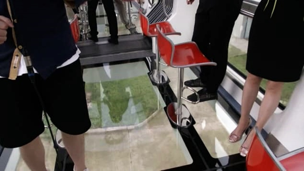 먼저 스카이 트레인의 외관입니다. 청두는 '판다의 도시'라고 불릴 만큼 판다가 매우 유명한데요. 이에 열차를 판다 모양으로 도색해두어 귀여움을 더했습니다. 또 하나 눈에 띄는 것은 선로의 궤도가 바로 열차의 위에 있다는 것입니다. 즉 열차가 위에 대롱대롱 달려서 가는 것이죠. 선로가 아래에 있는 것에 익숙한 많은 사람들은 이 자체만으로도 매우 스릴을 느낄 수 있습니다. 이것이 다가 아닙니다. 열차의 바닥은 투명한 재질로 만들었는데요. 이에 승객들은 발아래 경치를 보며 열차를 탈 수 있습니다. 이 열차는 바닥과 옆쪽의 창문을 통해 270도 뷰를 즐길 수 있습니다. 270도가 유리로 되어 있는 열차이기에 열을 반사할 수 있습니다. 이에 열차에서는 에어컨을 사용해 온도를 조절하고 있습니다.