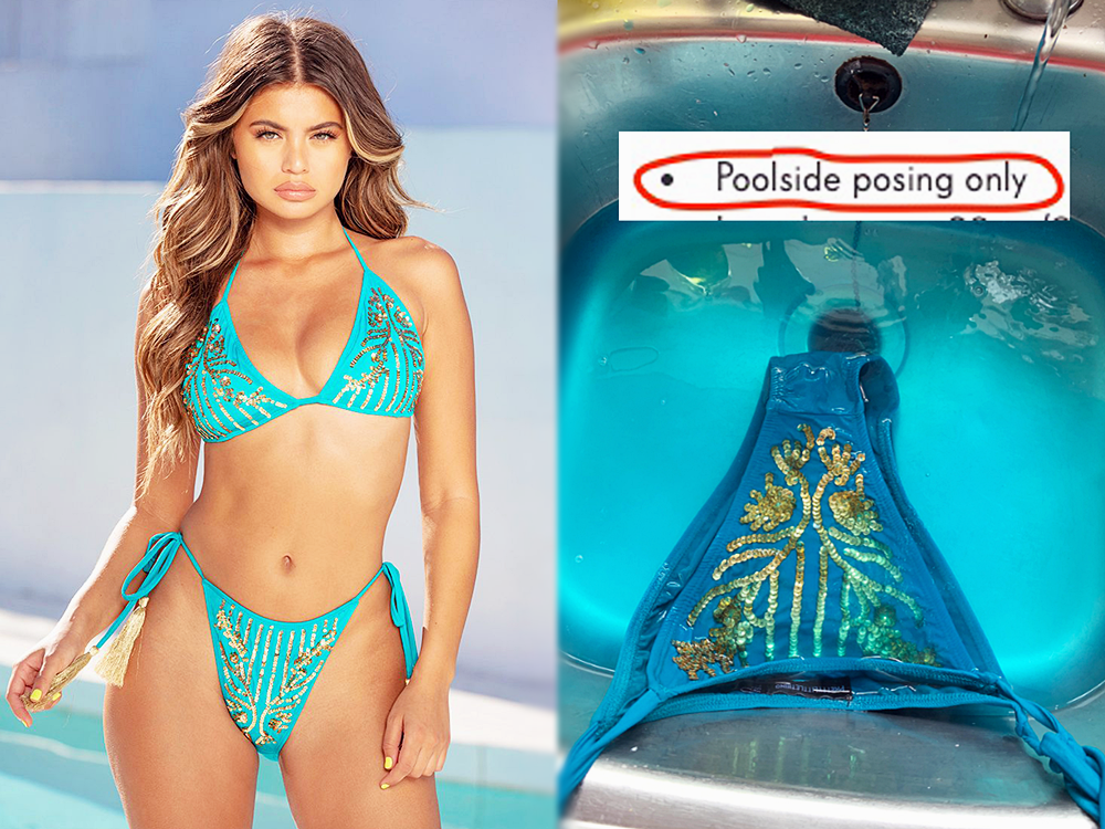 당황한 알리샤는 프리티리틀씽 측에 문의를 했습니다. 그러나 이 업체에서는 '이 수영복을 입고 물에 들어가선 안된다는 것'이 웹사이트에 확실히 명시되어 있었다는 답변을 내놓았죠. 웹사이트를 찾아보니 실제로 'for poolside posing only(수영장 밖에서 포즈를 취하는 용도로만 사용)'이라는 문구가 있었습니다.