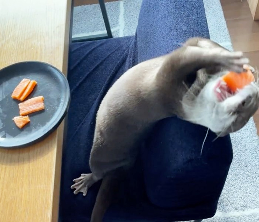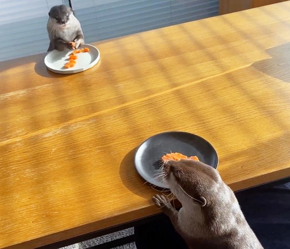 점심시간이 다가왔고 수달들은 다시 식탁에 앉았습니다. 이들은 연어를 한 번 더 먹었는데요. 코타로는 천천히 연어의 맛을 음미하는 반면 이번에는 하나로부터 연어를 지키기 위해 작은 손으로 연어를 움켜쥐어가며 먹고 있습니다. 이번에도 하나는 자신이 먹을 분량의 연어를 모두 먹고 테이블을 가로질러 코타로의 연어로 손을 뻗었는데요. 하나의 주인은 접시를 낚아채며 하나가 연어를 먹지 못하도록 하고 있네요.