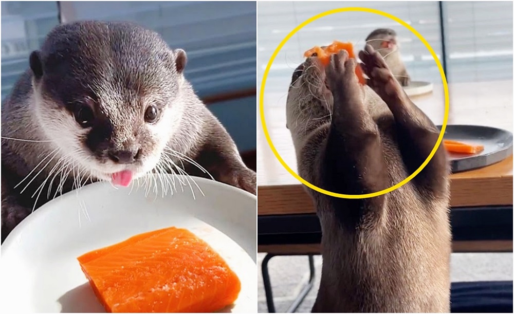 하나의 주인은 영상 속에서 '하나가 너무 통통해서 다이어트를 한다'라고 밝혔는데요. 이에 하나가 좋아하는 연어 간식을 끊은 지 꽤 되었다고 합니다. 그러나 다이어트는 절반의 성공을 거뒀고, 하나는 치팅데이를 가졌다고 하네요. 영상 속에서 수달 두 마리는 테이블이 가만히 앉아 간식을 기다리고 있습니다. 수달 두 마리는 각자 한 접시씩 연어를 받았는데요. 하나하나 음미하며 연어를 맛보는 코타로와 달리 하나는 게걸스럽게 이성을 잃고 연어를 폭풍 흡입하기 시작했습니다. 연어를 다 먹은 하나는 슬픈 비명을 질렀는데요. 이후 코타로의 접시에 있던 연어 한 조각을 낚아채며 더 먹었습니다.