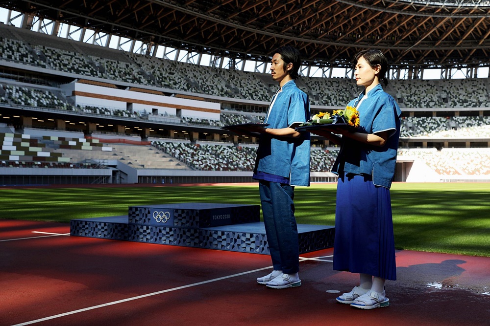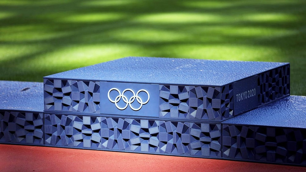이 시상대는 디자이너 도코로 아사오가 디자인했습니다. 그는 올림픽 엠블럼을 디자인하기도 했는데요. 엠블럼의 디자인을 차용해 일관성 있는 시상대 디자인을 만들어냈죠. 시상대의 디자인은 '다양성과 포용'의 메시지를 형상화하고 있다는 설명입니다. 시상대 옆 면에는 3차원으로 입체화된 엠블럼의 체크무늬 '이치마츠 모요'가 있는데요. 이는 일본의 전통 디자인을 기하학적으로 발전시킨 형태이며, 오늘날의 일본을 상징하고 있습니다. 시상대가 파란색인 것도 의미가 있습니다. 이는 일본 전통의 쪽빛 염색을 나타내는 것이라고 합니다. 시상대에 붙어있는 오륜기 또한 폐자재로 만들어진 것입니다. 이는 지난 2011년 동일본 대지진 피해 지역에서 임시 가옥에 건설에 사용되었던 알루미늄이라고 하네요.
