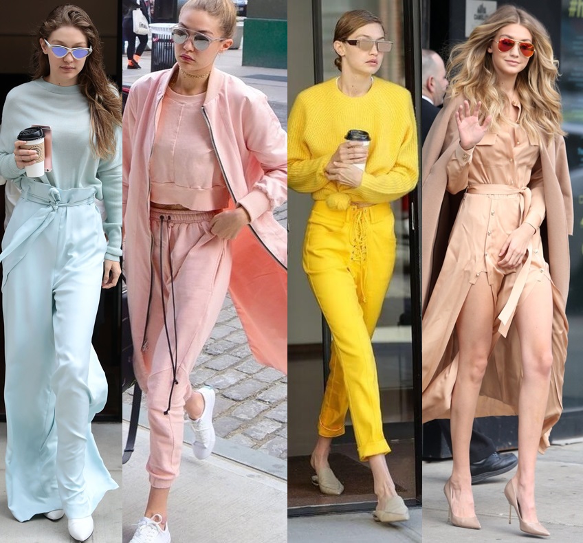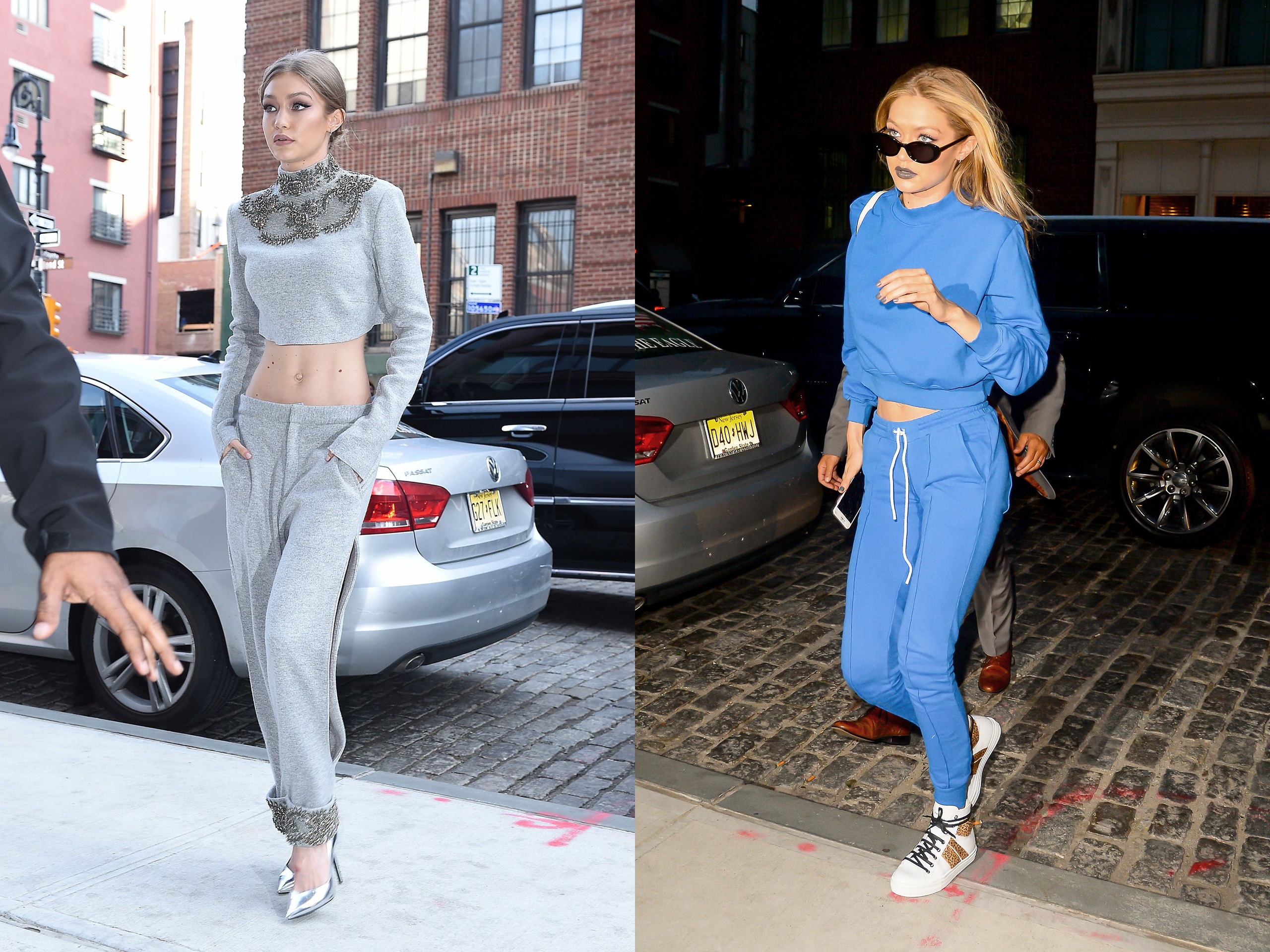 지지 하디드도 애슬레져룩을 자신만의 스타일로 잘 소화하는 것으로 유명합니다. 회색 트레이닝 세트에 은색 스틸레토를 매치했으며 파란색 애슬레져룩도 선보였네요. 크롭탑으로 자신의 몸매를 드러냈습니다.