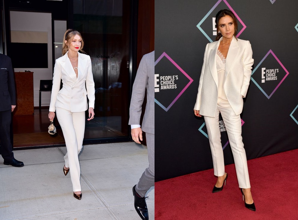 가장 무난한 화이트 컬러의 깔맞춤입니다. 유독 깔맞춤 패션을 자주 선보이는 지지 하디드(왼쪽)는 레이어드 된 목걸이와 클러치, 그리고 레드 립으로 패션을 완성했습니다. 새틴 소재의 화이트 슈트를 입은 빅토리아 베컴 역시 그녀의 트레이드 마크인 스틸레토 힐을 신어 시크한 느낌을 더했습니다.