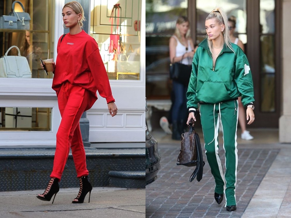 애 슬레 져 룩을 깔맞춤으로 활용해도 됩니다. 저스틴 비버의 그녀 헤일리 볼드윈은 빨간색, 초록색 트레이닝복을 입었으며 여기에 검은색 힐과 커다락 링 귀걸이를 이용해 화려함을 더했습니다.
