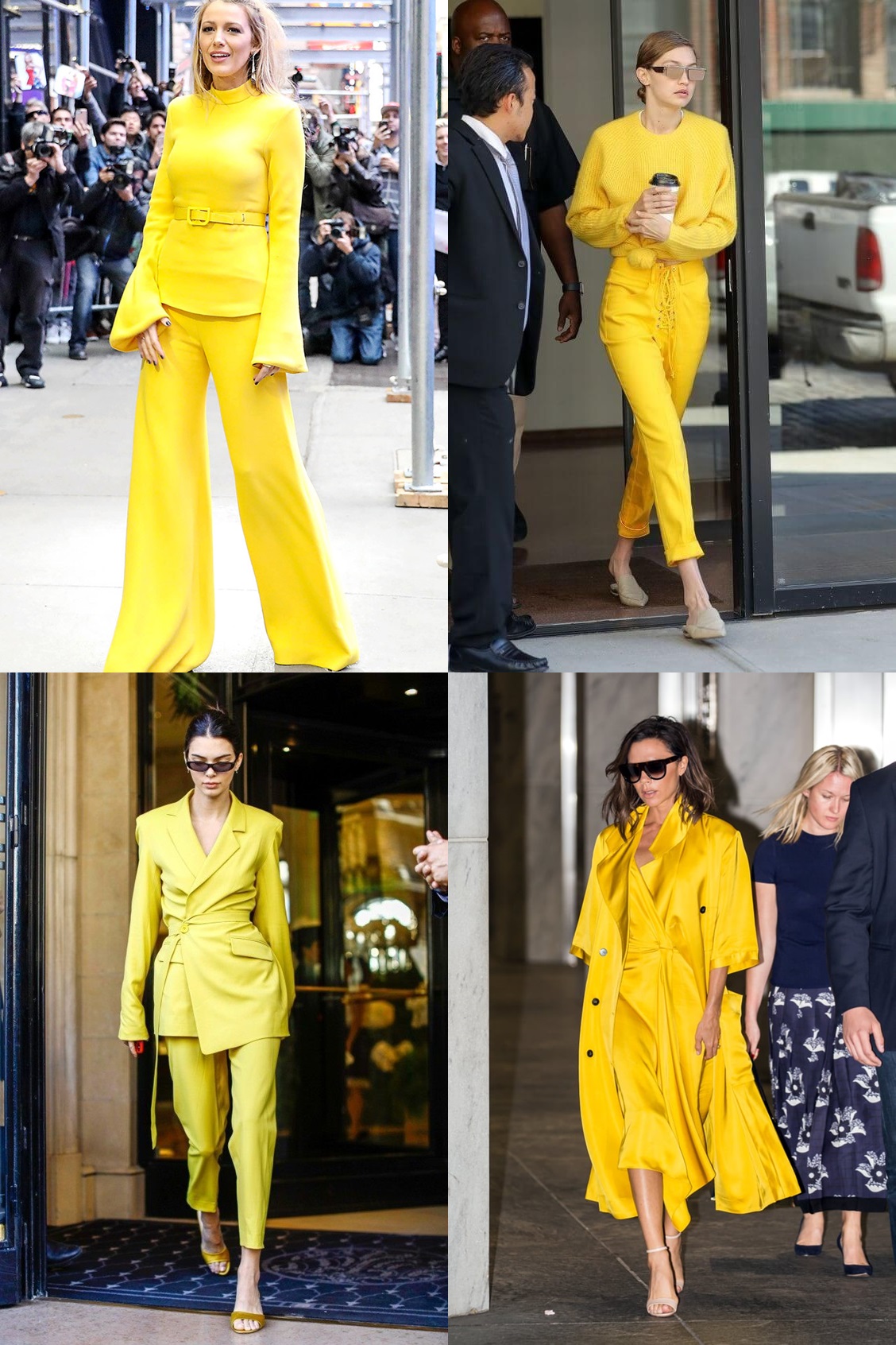 조금 더 과감하게 깔맞춤에 도전하고 싶다면 원색 계열로 맞춰 보는 것은 어떨까요? 블레이크 라이블리(좌측 상단)처럼 벨트까지 같은 색상으로 통일한다면 뭔가 차려입은 듯한 느낌이 듭니다. 반대로 스웨터나 롤업 팬츠 그리고 블로퍼로 편안하면서도 세련된 이미지를 선보인 지지 하디드(우측 상단)도 있습니다. 켄달 제너(좌측 하단)와 빅토리아 베컴(우측 하단)은 심플한 스트랩 슈즈를 신어 노란색이 더욱 돋보이도록 만들었네요.