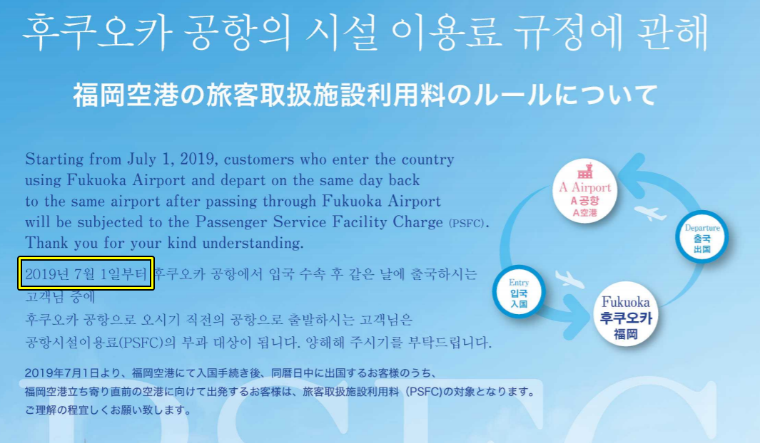 다만 후쿠오카 공항 시설 이용료 규정은 오는 2019년 7월 1일부터 적용됩니다. 당일치기 여행을 계획하는 분이라면 7월 전에 여행을 하는 것도 좋은 생각이겠죠?