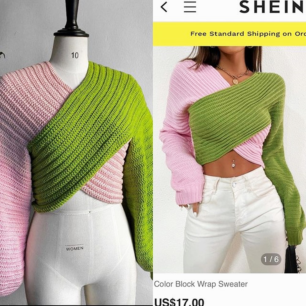 그리고 또 하나의 디자인 도용 사례가 발각되며 큰 화제가 되고 있습니다. 이번에 디자인을 도용한 곳은 중국에 본사를 두고 있는 글로벌 패션 브랜드 쉬인(Shein)입니다. 얼마 전 엘렉시아이(Elexiay)라는 이름의 나이지리아 영세 브랜드에서는 자사의 SNS에 자사에서 만든 330달러짜리 스웨터와 쉬인에서 판매하고 있는 17달러짜리 스웨터의 이미지를 나란히 비교해서 올렸습니다. 그리고 '쉬인에서 디자인을 훔쳤다'라고 밝혔습니다.