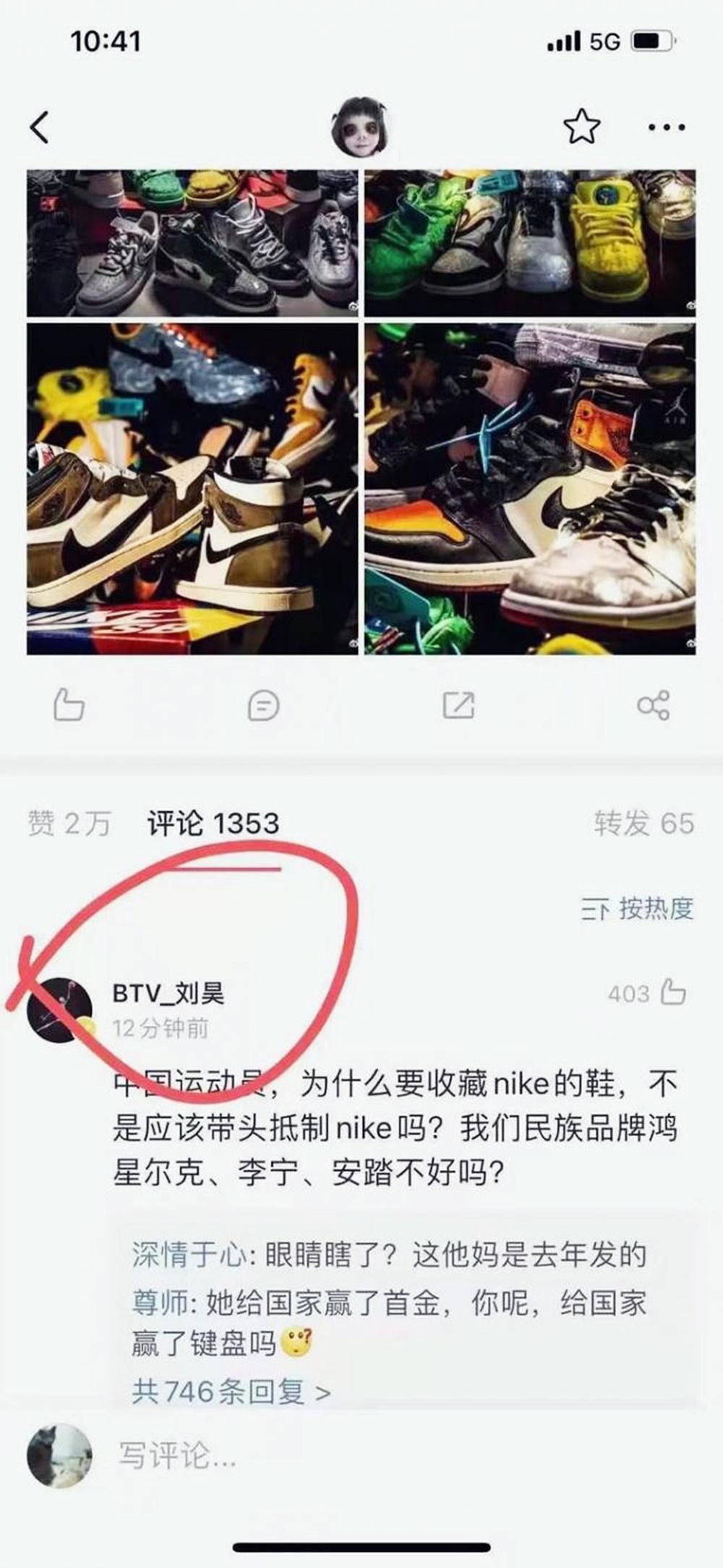 류하오는 양첸이 2020년 12월 31일에 올린 웨이보 포스트를 다시 끄집어냈는데요. 양첸의 웨이보 포스트에는 양첸이 나이키 신발을 모아 두고 찍은 사진이 있었던 것이죠. 그리고 이 포스트에 '중국 운동선수들. 왜 나이키 신발을 모으나요? 나이키 보이콧하는데 앞장설 순 없나요? 니링, 안타 같은 국내 브랜드로는 성에 안차나요?'라고 적었죠.