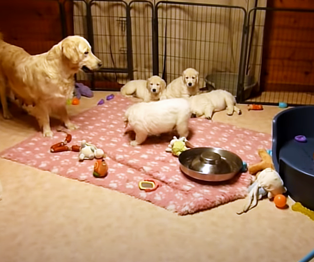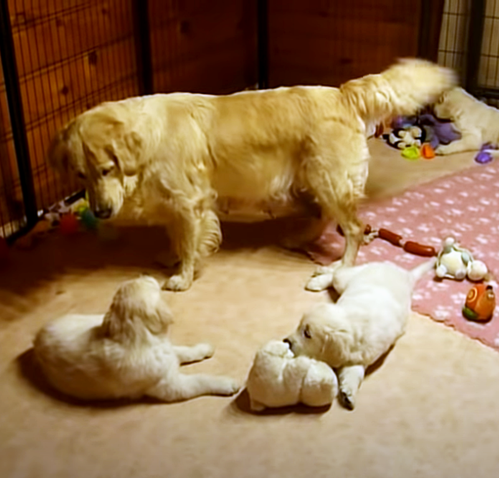 이 골든 리트리버 가족은 모두 함께 큰 방에서 생활하고 있는데요. 엄마는 이 여섯 마리의 강아지를 '엄마 모드'가 되어 지켜보고 있습니다. 어떤 아기 강아지들은 자고 있고, 어떤 강아지들은 조용히 구석에 앉아있고, 어떤 강아지는 또 함께 놀고 있는데요. 엄마는 이 놀고 있는 강아지들에게 주목했습니다.