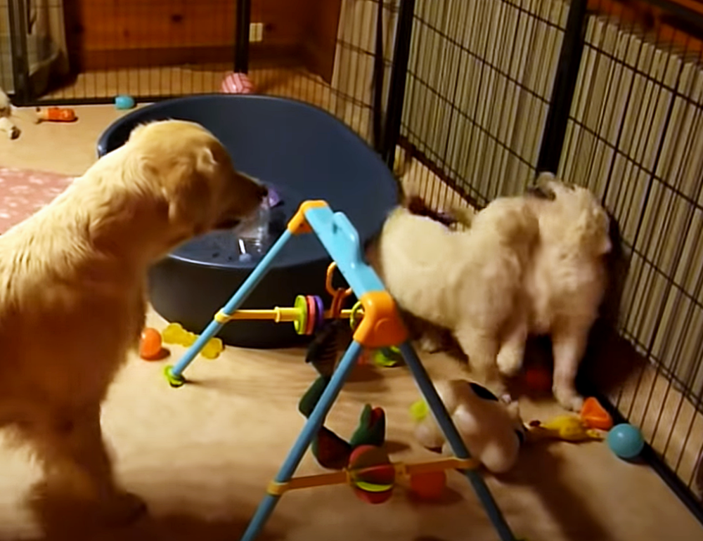 이 골든 리트리버 가족은 모두 함께 큰 방에서 생활하고 있는데요. 엄마는 이 여섯 마리의 강아지를 '엄마 모드'가 되어 지켜보고 있습니다. 어떤 아기 강아지들은 자고 있고, 어떤 강아지들은 조용히 구석에 앉아있고, 어떤 강아지는 또 함께 놀고 있는데요. 엄마는 이 놀고 있는 강아지들에게 주목했습니다.