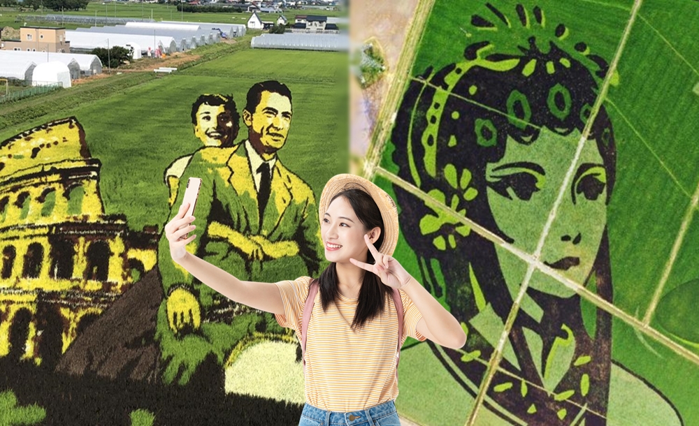 바로 '논 아트'입니다. 논에 그림을 그리는 것이죠. 논을 하나의 거대한 캔버스로 삼고 이 위에 작품을 만들어내고 있습니다. 이 그림을 그릴 수 있는 비결은 바로 다른 품종의 벼를 심는 것인데요. 이 작품은 4월 경 디자인 해 모내기를 한 후 10월 벼가 황금색으로 익어 수확할 때까지 놔둔다고 하네요. 실제로 이 광경을 보기 위해 전국에서 많은 사람들이 몰려오고 있습니다.