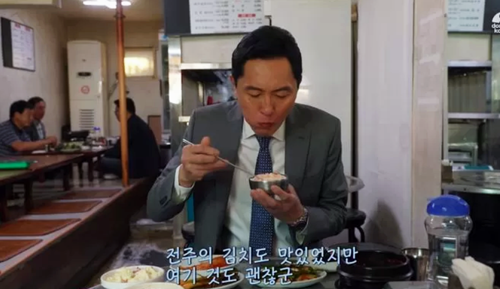 지난 2018년 <고독한 미식가>는 한국에서 촬영을 하기도 했습니다. 바로 시즌 7의 9화와 10화였죠. 9화에서 고로씨는 전주에 위치하고 있는 한 가정식 백반집에 들어갔는데요. 이곳에서 6천 원짜리 정식을 시켰습니다. 정식에는 제육볶음, 청국장찌개, 김치, 계란후라이, 각종 나물 반찬 등이 포함되어 있었죠. 고로씨는 식당 아주머니의 조언에 따라 이 반찬들을 밥과 함께 셀프 비빔밥으로 비벼먹고, 이를 상추에 싸 먹는 등 먹음직스러운 먹방을 선보였습니다.