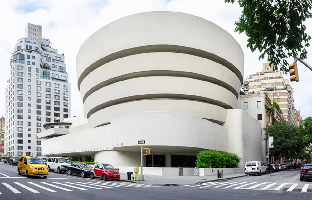 달팽이처럼 생긴 구겐하임 미술관은 '자연과 인공, 그리고 사람이 하나가 되기를 원했던' 건축가 프랭크 로이드 라이트가 설계한 것입니다. 이 건물에는 계단이 없으며 엘리베이터를 타고 곧장 꼭대기 층으로 올라간 뒤 경사로를 따라 내려오며 미술품을 관람할 수 있습니다. 즉 작품이 평평한 곳에 전시되는 것이 아니라 경사진 곳에 전시되는 것이죠. 사실 이는 지금까지도 많은 예술가의 비판을 받고 있지만 현재 이곳은 뉴욕에서 빠질 수 없는 건축물이 되었습니다.