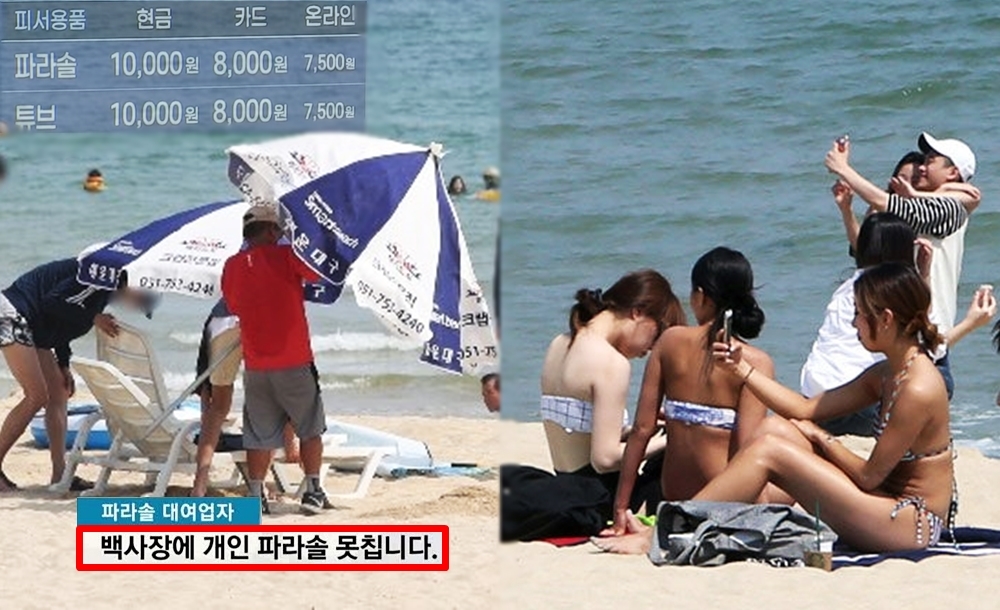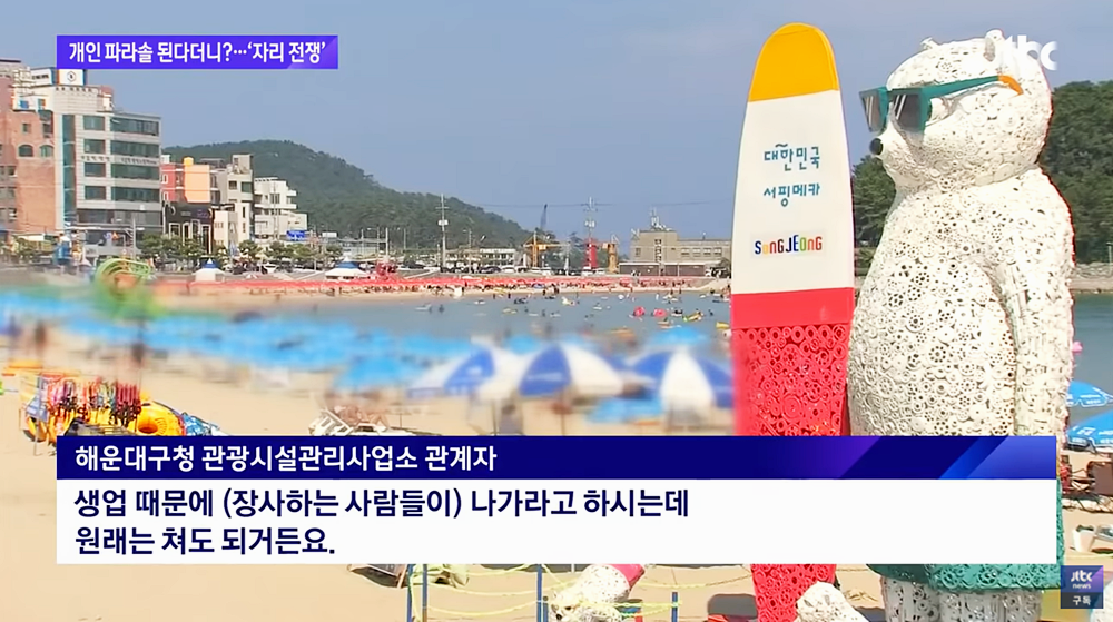 JTBC의 보도에 따르면 부산 해운대구에 위치한 한 인기 해수욕장에서도 이런 분쟁이 일어났다고 하는데요. 파라솔 대여 업체는 자신들도 지자체에 돈을 내고 계약을 맺은 것이라며 이것이 '구청에서 정한 규칙'이라고 주장했습니다. 그러나 구청 관계자는 '생업때문에 파라솔을 못 치게 하지만 원래는 쳐도 된다'는 답변을 내놓았죠.
