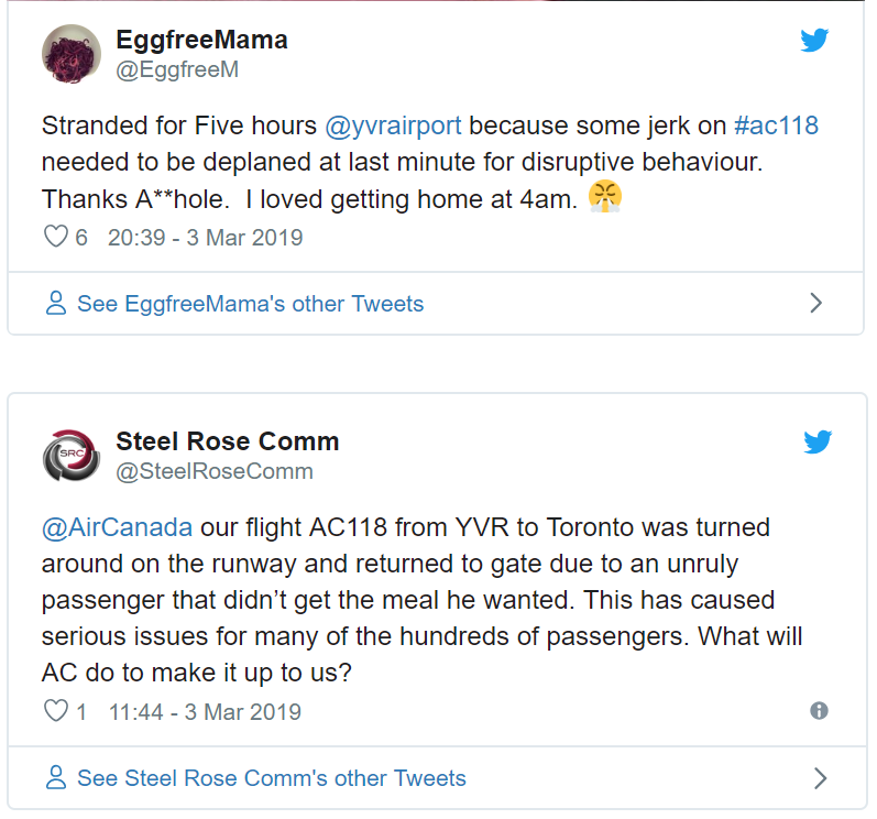 얼마 전 밴쿠버에서 출발해 토론토로 가는 에어캐나다의 한 비행기는 비행기 활주로까지 갔다가 다시 게이트로 돌아왔습니다. 왜냐하면 난동을 부리는 승객을 비행기 안에서 내쫓기 위해서였습니다.