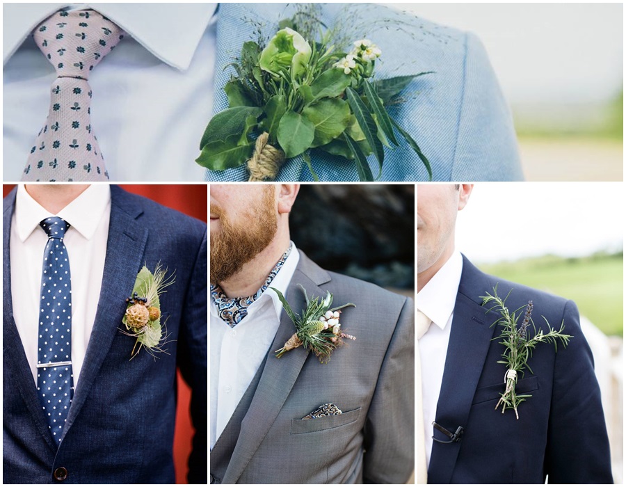 부토니아에 꼭 꽃이 주로 들어가야하는 것은 아닙니다. 꽃을 최소화하고 초록색 잎, 솔방울, 열매 등을 함께 묶어도 됩니다. 네이비 슈트에 라벤더와 로즈메리 잎으로 묶은 부토니아(하단 우측)를 매치하니 독특하면서도 매우 세련돼 보입니다.