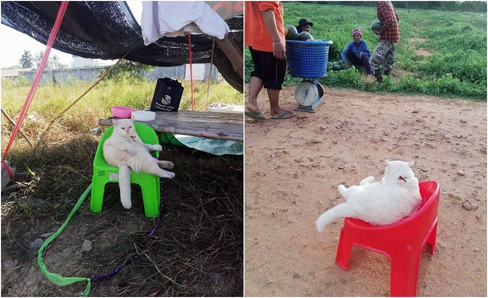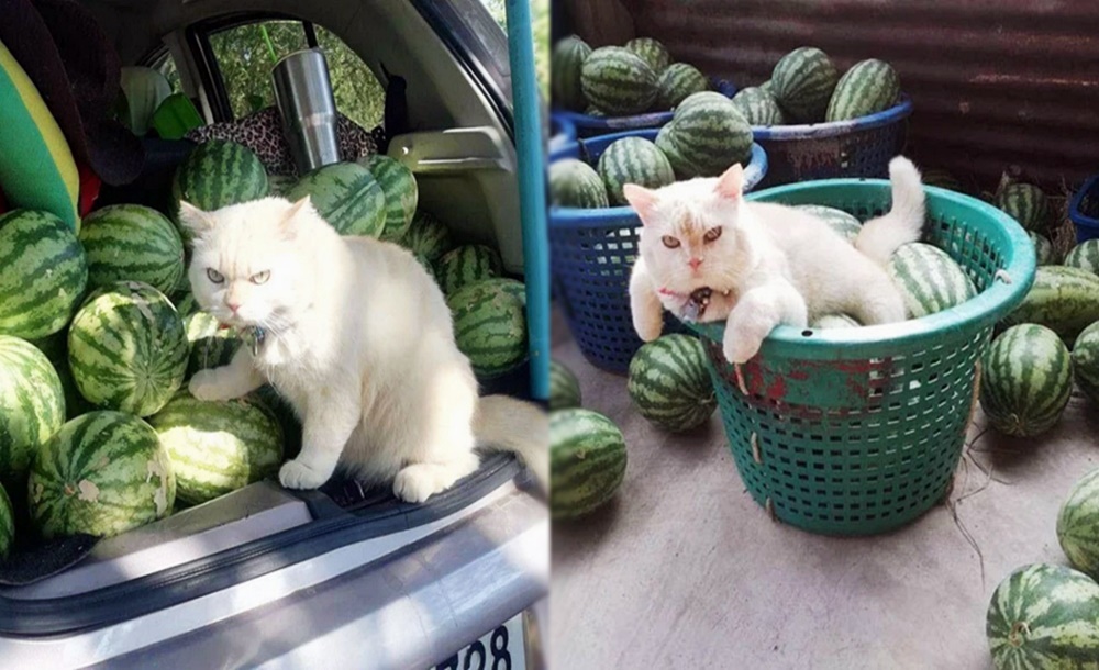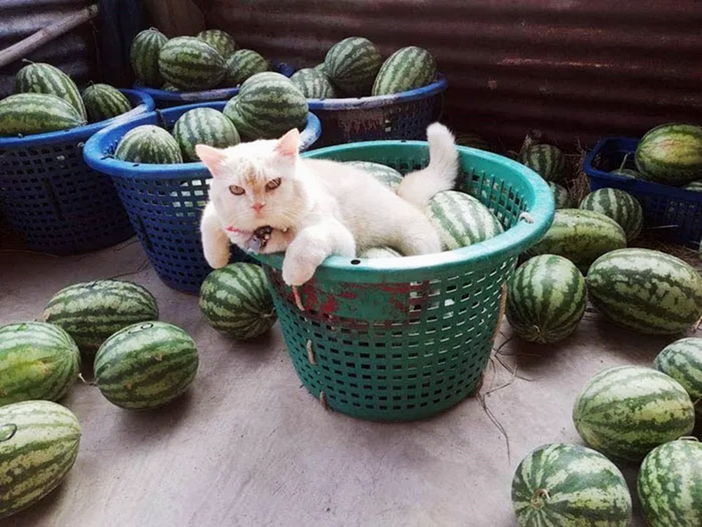 펄은 사실 손님들에게 그리 상냥한 고양이는 아닙니다. 수박 앞으로 지키고 앉아 마치 째려보듯 매의 눈으로 손님들을 감시하고 있습니다. 수박을 사러 온 손님도 괜히 머쓱해지는 펄의 철통 보안에 펄의 주인은 흐뭇하기만 합니다. 그러나 주인은 펄이 보기보다 상냥하다며 펄을 변호하고 있네요.