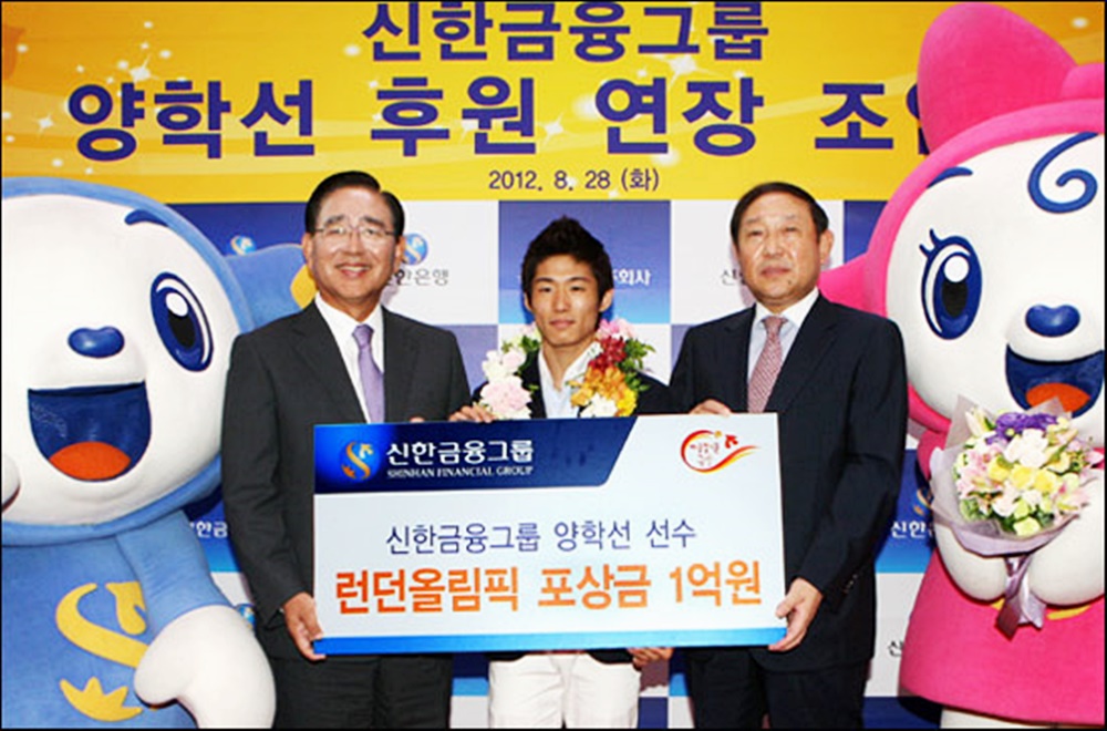 이외에도 박원진, 최명진, 배윤진 등 기초 종목 유망주도 지원하고 있습니다. 신한금융은 2011년 비인기 종목 스포츠 유망주 육성 지원 프로그램인 '신한 루키 스폰서십'을 시작했습니다. 이 프로그램으로 지원한 첫 선수가 바로 2012 런던 올림픽에서 대한민국 체조 역사상 최초로 금메달을 딴 양학선이죠.